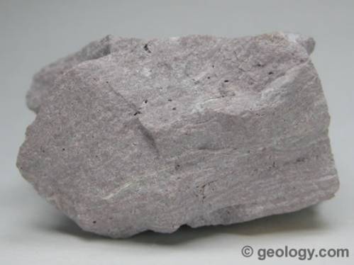 Rhyolite is a light-colored, fine-grained, extrusive igneous rock that typically contains quartz and feldspar minerals. The specimen shown above is about two inches (five centimeters) across.